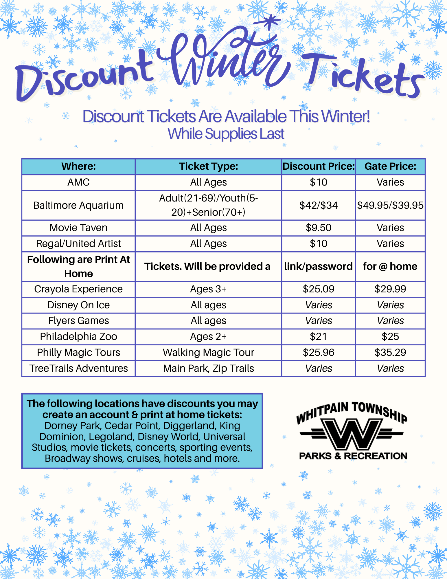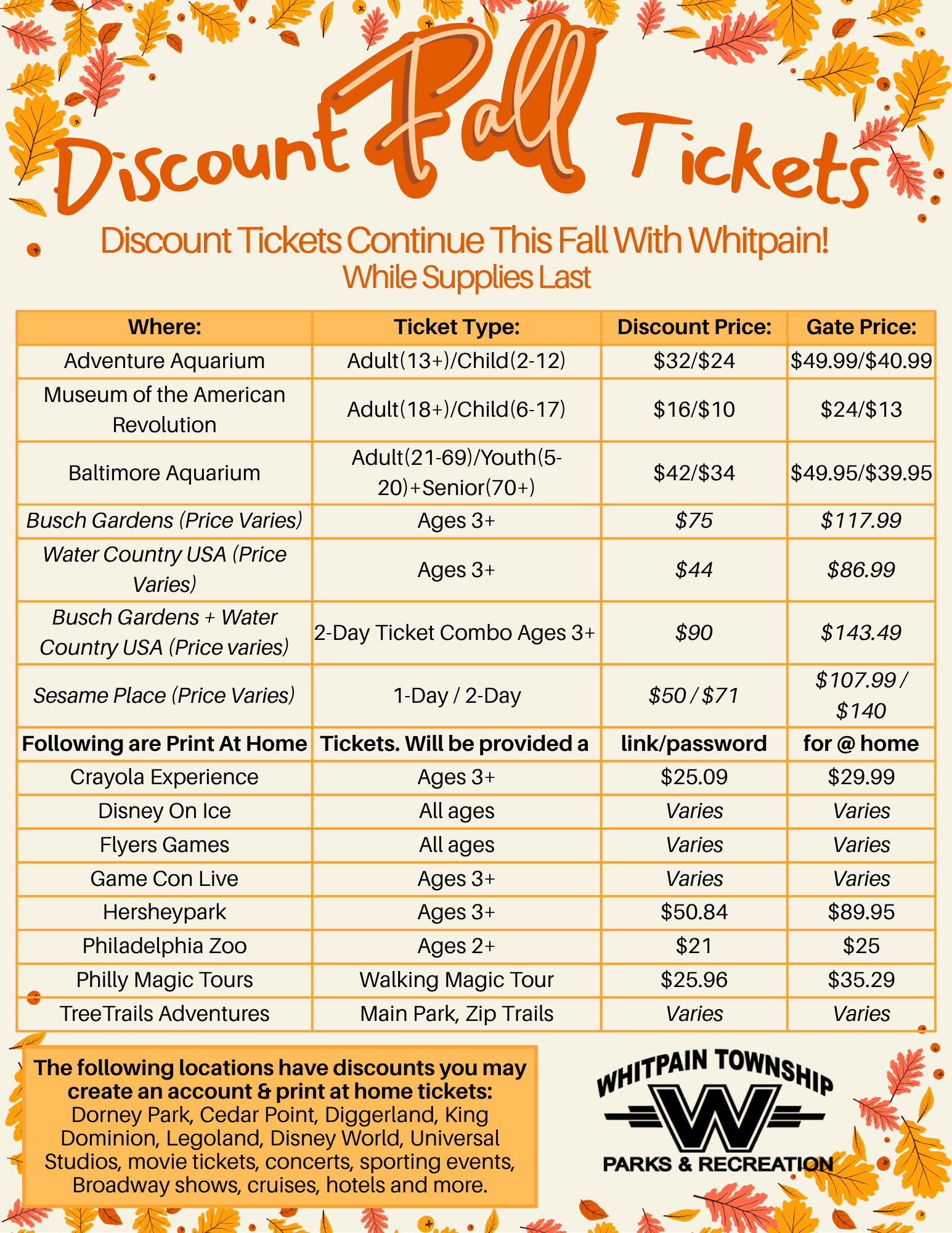 Through Whitpain Township Park and Recreation Department’s membership in the Pennsylvania Recreation and Park Society, we are pleased to be able to pass along the opportunity for residents to purchase discounted tickets to Dorney Park, Hersheypark, Cedar Point, Diggerland, Kings Dominion, Legoland, Disney World, Universal Studios, Movie Tickets, Broadway/Off-Broadway Shows, Cirque du Soleil, sporting events, concerts, and more. Click here for deals!